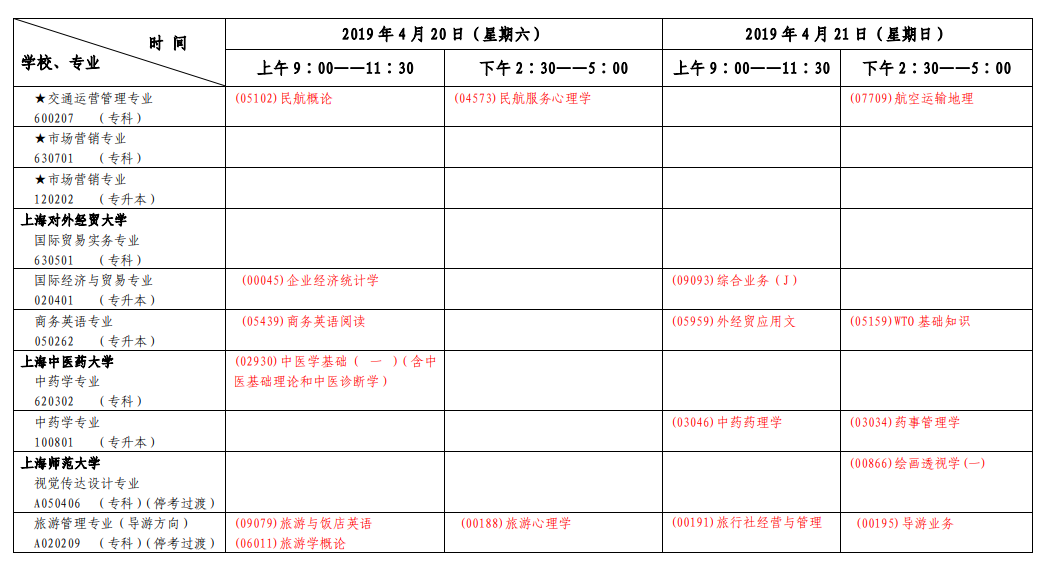 2019年4月上海市高等教育自学考试各专业课程考试日程安排表(第二周)